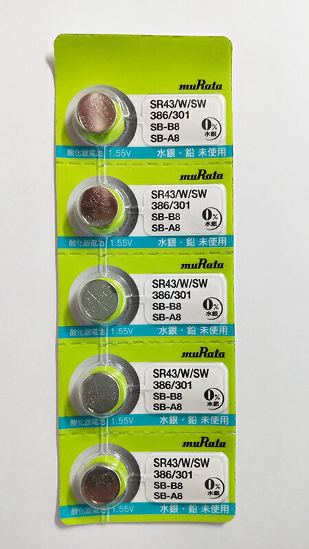 ムラタ酸化銀電池「SR43 W / SW」 直径11.6mm 厚み4.2mm ムラタ製の腕時計用ボタン電池です。 時計の電池交換にどうぞ。 ※SR43には「SW」と「W」の2種類がありますが、この電池で共通となりました。 1個単位と5個単位の販売をしており、同一種類を5個単位のほうがお値段がお得になっております。 画像は5個パックのものですが、1個単位の場合ここから切り分けてお送りします。 ここは5個単位の販売ページです。 1個単位は「こちら」からお買い求め下さい。