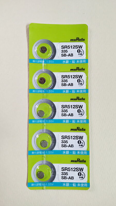 ムラタ酸化銀電池「SR512SW」 直径5.8mm 厚み1.2mm ムラタ製の腕時計用ボタン電池です。 時計の電池交換にどうぞ。 1個単位と5個単位の販売をしており、同一種類を5個単位のほうがお値段がお得になっております。 画像は5個パックのものですが、1個単位の場合ここから切り分けてお送りします。 ここは5個単位の販売ページです。 1個単位は「こちら」からお買い求め下さい。