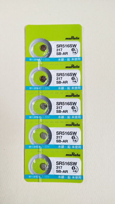 ムラタ酸化銀電池「SR516SW」 直径5.8mm 厚み1.6mm ムラタ製の腕時計用ボタン電池です。 時計の電池交換にどうぞ。 1個単位と5個単位の販売をしており、同一種類を5個単位のほうがお値段がお得になっております。 ここは1個単位の販売ページです。 5個単位は「こちら」からお買い求め下さい。
