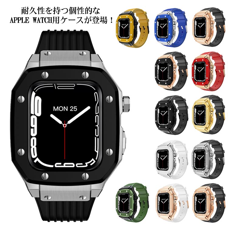 送料無料 アップルウォッチ Apple Watch バンド ベルト ケース 一体型 高級 人気 メンズ おしゃれ かわいい キラキラ 8 7 6 SE 5 4用 44mm 45mm用 シリコン チタンケース 黒 白 ブラック ホワイト ゴールド シルバー ピンクゴールド