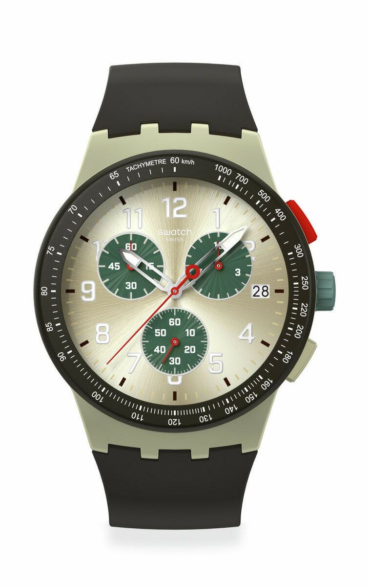 [型番:SUST402]サンレイ仕上げのシルバーカラーの文字盤にダークグリーンのサブダイヤル、シルバーカラーの暗闇で光る時針と分針、レッドの秒針、サブダイアルの針を配し、3時位置にデイト表示窓を備えたクロノグラフ。マットベージュのケースには、マットダークブラウンのベゼルと、ホワイトでプリントしたタキメータースケール、マルチカラーのクラウンとプッシャーが搭載されています。マットダークブラウンのストラップと、同色のループとマットベージュのバックルがアクセントを添えています。■カラー:**■ケースサイズ:縦50.1mm 横42.0mm 厚さ14.3mm※( )で表記されている数字はヌードサイズです。ヌードサイズとは衣服を身につけない身体のサイズです。お客様ご自身の身体サイズと比較してお選びください。 ■素材: ■ケース素材:プラスチック■風防素材:バイオ由来素材■ベルト素材:シリコン■仕様:クォーツ・クロノグラフ・3気圧防水 ■お手入: ムーヴでお買い上げの商品は電池交換1回無料(一部除外品有)・ブレスサイズ調整無料です。 >>商品のお取り扱い方法 ■原産国:OBSIDIAN INK【国内正規品】SUST402/スウォッチ(SWATCH)**画面上と実物では、多少色具合が異なって見える場合がございます。