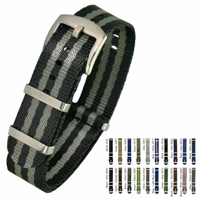 商品説明 細やかに編み込まれた、耐摩耗性にも優れたポリアミド素材を使用しています。 通常のNATOタイプのベルトよりもしなやかでツヤがある、高級感あふれるベルトです。 商品スペック カラー ブラック Black (019) カーキ Khaki(027) ネイビー Navy (063) グリーン Green (073) グレー Grey (091) ブルーホワイト Blue / White (817) ブラックグレー Black / Grey (819) ネイビーレッド Navy / Red (862) ブルーグレー Blue / Grey (863) ブラックブルー Black / Blue (865) ブラックレッド Black / Red (883) ブラックオレンジ Black / Orange (886) ブラックシルバー Black / Silver (891) グリーンイエロー Green / Yellow (897) シルバーブラック Silver / Black (912) ブルーライトブルー Blue / Light Blue (963) グリーングレーGreen / Grey (971) ブラックグリーンレッド Black / Green / Red (973) ブラックホワイトレッド Black / White / Red (983) グレーイエロー Grey / Yellow(997) 素材 ナイロン 長さ 【男性用サイズ】 全長:280mm 厚さ 【男性用サイズ】 約1.5mm サイズ展開 【男性用サイズ】 E20mm-B20mm ※【E】は時計に装着する側の幅、【B】はバックルの幅です。 ご注文の際はEサイズをご指定下さい。※『時計ベルト取り付け幅(Eサイズ)』及び 『尾錠取り付け幅(Bサイズ)』につきましては、表示のサイズから約0.3mm〜0.8mm程度広く作られています。取り付けられなかった際は無料でお取替えさせていただきますのでご安心ください。 ※ギフトラッピング(有料)はこちら>>>詳しい交換方法はコチラ>>> オメガにぴったりな他のベルトを探す>> このベルトの詳細を見る>> オメガ腕時計の装着例を見る>>