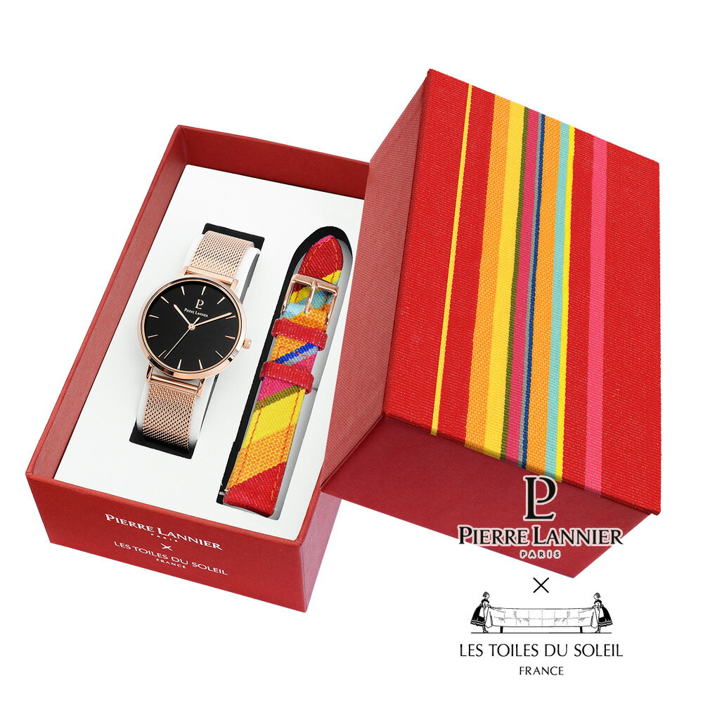 PierreLannier 腕時計 レディース ブランド クオーツ レ・トワール・デュ・ソレイユ 防水 限定 コラボ セット ピンクゴールド 黒文字盤 金属ベルト 革ベルト フランス製 プランソレイユ 誕生日 母の日プレゼント お祝い 仕事 20代 30代 40代 50代 60代