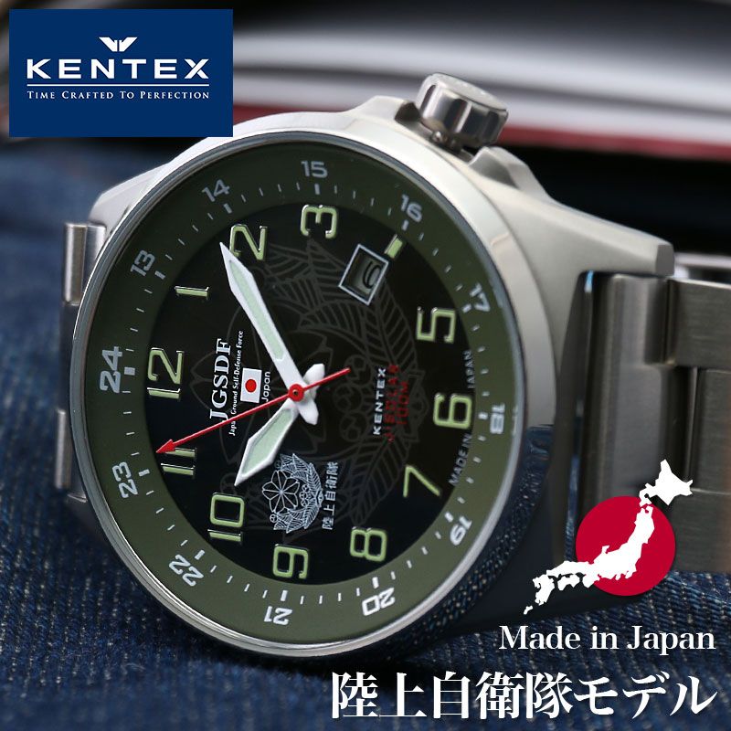メーカー希望小売価格はメーカーサイトに基づいて掲載していますこの商品のお問い合わせ番号CPR-item-22120913■ 商品詳細説明 ケンテックス[KENTEX]世界中の有名ブランドのOEMメーカーとして数々のモデルを作り上げてきたケンテックス社が1997年に創設したオリジナルブランドがKENTEXです。一流ブランドの時計づくりで蓄積した高い技術力をベースにしたリーズナブルな価格での製品は、ブランド発表後、瞬く間に時計ファンの間に知られる存在となり、注目のブランドとなっています。ケンテックスは「最高の時計をリーズナブルな価格設定で、デイリーユースとして最適で満足できる時計」を理念としています。ケンテックスの時計づくりの情熱はこだわりとなって、長い時間をかけて、より完成度を追求した本物の時計をつくることに注がれています。その本物とは「人に感動を与えるものづくり」ではないかと思います。品質、デザイン性の高さと同時に実用性の高さが備わっていることが本物には必要な条件です。そして本物は、最高の時計をつくる情熱と、それを裏付ける高い技術力がうまく融合した時に始めて生まれるものではないでしょうか。ケンテックスのものづくりの底辺にあるのは流行に左右されない、時代を超えた本物の魅力を引き出す努力です。ケンテックスには妥協を許さない職人気質が息づいています。流行に左右されずに自分の価値観を信じてモノの本質を見抜く。ブランドに迷わされずに価値あるいいものをリーズナブルな価格で選びたい。ケンテックスはそんな、モノにこだわりを持つ人たちにふさわしい時計です。[ 商品ポイント ]本物の証「陸上自衛隊モデル」文字盤に配置された日本国旗とエンブレムが防衛省公認の本物の証です。重厚感のあるステンレスバンドフォーマルシーンにも馴染むメタルバンドを採用。バックル部分にも「JSDF」が刻印されており細部までこだわった仕上がりに。美しい曲線を描くサイドデザイン日本製ならではの非常に丁寧で美しい仕上げが特徴的なステンレスケース。強蓄光インデックス針とインデックスには蓄光塗料を塗布。暗闇で発光するので夜間でも時間の確認が行えます。信頼のMade In Japan裏蓋には「JSDF」のロゴが刻印され細部まで抜かりない仕上がり。国内製造にこだわり日々品質の追及を行っています。主張しすぎない存在感主張しすぎない絶妙なサイズ感は服装を選びません。ミリタリースタイルだけでなくカジュアルやフォーマルにもお使いいただけます。品番S715M-04駆動方式ソーラー素材:ケースステンレススチール素材:ベルトステンレススチール(ピン式)風防フラットミネラルガラス文字盤カラーグリーンベルトカラーシルバーサイズ(縦×横×厚)約50×44×10mmかん幅約22mmベルト腕周り最大約21cm重さ約140g防水日常生活用強化防水(10気圧)仕様日付表示駆動期間:フル充電時約6ヶ月クイックスタート機能(1000LX以上の光の接触により数秒で再稼動)蓄光(針・インデックス)日本製付属品ブランド純正BOX取扱説明書保証書※付属品に関して入荷時期により仕様、内容が一部異なる場合がございます。また、ブランドにより説明書兼保証書が付属する場合がございます。予めご了承をお願い致します。