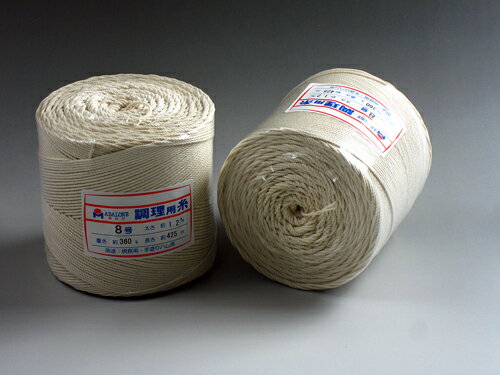 安心して使える国産の純綿製調理糸!ご家庭からプロ用まで用途に応じて選べます。【規格】8号【重量】約360g【太さ×長さ】約1.2mm×425m 豊富なサイズバリエーション! 国産品です♪