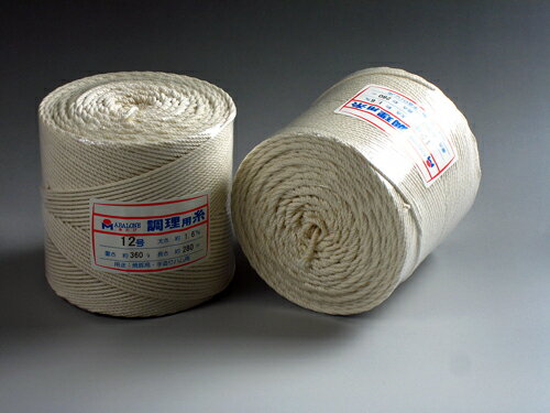 安心して使える国産の純綿製調理糸!ご家庭からプロ用まで用途に応じて選べます。【規格】12号【重量】約360g【太さ×長さ】約1.6mm×280m 豊富なサイズバリエーション! 国産品です♪