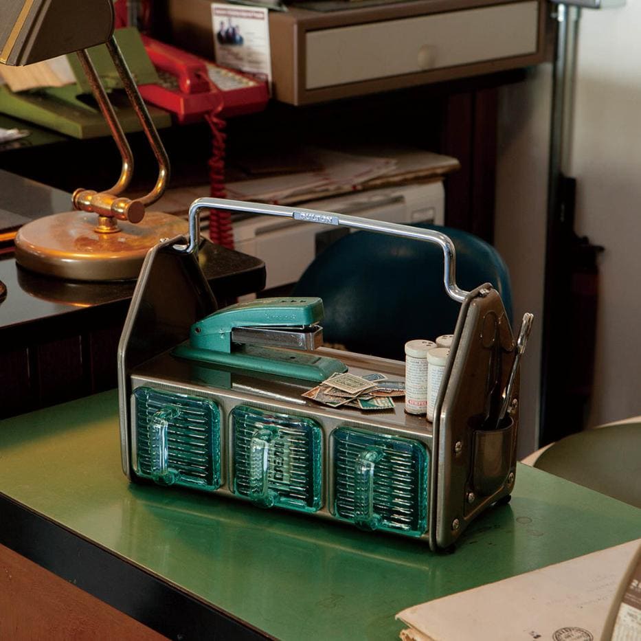 商品情報 ダイニングテーブルやデスク傍に置いて、調味料や小物をまとめておけるオーガナイザー。 3つのガラス容器、トップトレイ、サイドポケットと3タイプの収納スペースで構成されており、 角砂糖やクリップなどの細かなものから、調味料やグラス、ペンやハサミなどの様々な形状の小物を収納できます。 頑丈なスチールの枠組みと分厚く青みがかったガラス容器の組み合わせは、クラシカルでありながら新鮮な存在感も。 これを置くために中に入れる小物を用意したい、そんな衝動買いも大歓迎のアイテムです。 商品詳細 サイズ 本体:幅280×高さ205×奥行き150(mm) トップトレイ:幅260×奥行き90(mm) ガラスケース:150ml×3個 重量 - カラー アイボリー、グリーングレー、ロー 材質 スチール、ソーダガラス 付属品 ガラスケース×3個 仕様 ※付属のハンドルをネジで固定してください。(組立工具は付属しておりません) 備考 ガラス容器は一般的な食器と同様に洗浄いただけます。ご使用前に必ず洗浄してください。ガラス容器は食品を入れることができますが、密閉性がない容器のため個包装されたものを推奨します。また、液体の収納はできません。塩類の強い食品は本体の腐食を誘発する可能性がありますのでお控えください。製品のサイズ・形状、また容器の開閉には個体差があります。 注意事項 商品のデザイン・仕様は改善のため、入荷のタイミングにより予告なく変更する場合がございます。ご了承ください。 実物に近い色を画像で表現していますが、撮影環境、お使いのディスプレイなどの条件によって多少の誤差が生じる場合がございます。 ご注文タイミングやご注文内容によっては、購入履歴からのキャンセル、修正を受け付けることができない場合がございます。