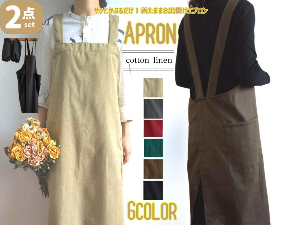 ゆったりすぽっと被るだけ そのまま外出! ワンピース エプロン 2点セット アームカバー ロング丈 男女兼用 コットンリネン レディース ポケット バッククロス ゆったりサイズ ジャンパースカート エプロンドレス 割烹着 6色