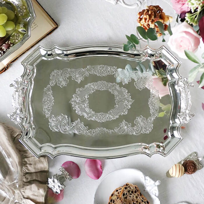 サイズ:幅38.5 x 奥行24 x 高さ3.5cm中央部分:幅29 x 奥行20cm重さ:650g 色:シルバー 材質:Sheffield Silver (シルバープレーティッド)ROYAL FAMILY SILVER TRAY WITH HANDLEロイヤルファミリー シルバー ハンドル 付きトレー イタリアのシルバー製品ブランド ROYAL FAMILY(ロイヤルファミリー)から、素敵なハンドル付きトレーが入荷致しました。 銅の上にシルバーメッキをかける伝統的な製法で作られた美しい銀食器。 いわゆる「シルバーオンコッパー」と呼ばれるものです。 お客様にちょっとお飲物をお出ししたり、調味料やシュガー&ミルクなどをテーブルに置いておくのにちょうど良いサイズ。ハンドル付きなので持ち運びもしやすく、シンプルでクラシカルなデザインのトレーは、1つは持っておきたいアイテムです。 ブランドの詳細はこちらから → シルバーコーティングされている製品は、経年により変色いたします。変色してきましたら、通常のシルバー専用の磨き剤で磨いてお手入れしてくださいませ。磨きながら大切に、ずっと長く使っていただけるのがシルバー製品の特徴です。シルバーの表面には擦ったような部分や、黒ずみがみられる場合がございます。予めご了承頂けますようお願い致します。 高級感漂うシルバーのトレーは、テーブルに品格を添えます。優雅なティータイムにピッタリな華やかなデザイン。インテリアとしても楽しめる、優雅なひとときを演出する逸品です。 持ち手がついているため、持ち運びも簡単です。 エレガントで格式あるデザインが特徴です。裏面には滑り止めがついています。刻印は製造ロットにより個体差がございます。
