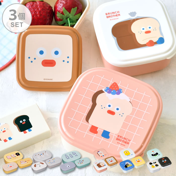 詳細説明【特長】・きょとんとした表情がかわいい3サイズのランチボックスのセットです。・サイズ違いの入れ子式なので、食べ終わった後、コンパクトにまとめられます・。ゆるかわいいキャラクターたちのデザインは、忙しい日々やリラックスしたい休日のランチタイムを癒してくれます。・箸やスプーン箱セットやランチバッグなどといっしょに、お気に入りのキャラクターでトータルコーディネートするのもおすすめです。・フタを外せばレンジの使用も可能です。 商品仕様(スペック)デザイン:トースト本体サイズ(約):縦130x横130x厚60mm容量(約):[S]180mL [M]300mL [L]480mL素材:[本体]PP [フタ]PE耐熱温度(約):[本体]140℃ [フタ]60℃注意事項・火のそばに置かないでください。・煮沸消毒は変形することがありますのでしないでください。・食器洗浄機・食器乾燥機には、変形することがありますので入れないでください。・電子レンジを使用する際は、必ずフタを外してください。・電子レンジ加熱では容器が過熱することがありますので、やけどに注意してください。・落とす、ぶつけるなど強い衝撃を与えないでください。ケガや変形、破損の原因になります。・表面に傷が付きますので、タワシや磨き粉の使用はお避けください。・使用後は、食器用中性洗剤を用いて、湯又は水で洗ってから、柔らかい布で拭き取ってください。・オレンジオイル系洗剤は使用しないでください。製品の劣化や、絵柄の部分が色落ちすることがあります。 韓国発の人気キャラクター「ブランチブラザー」