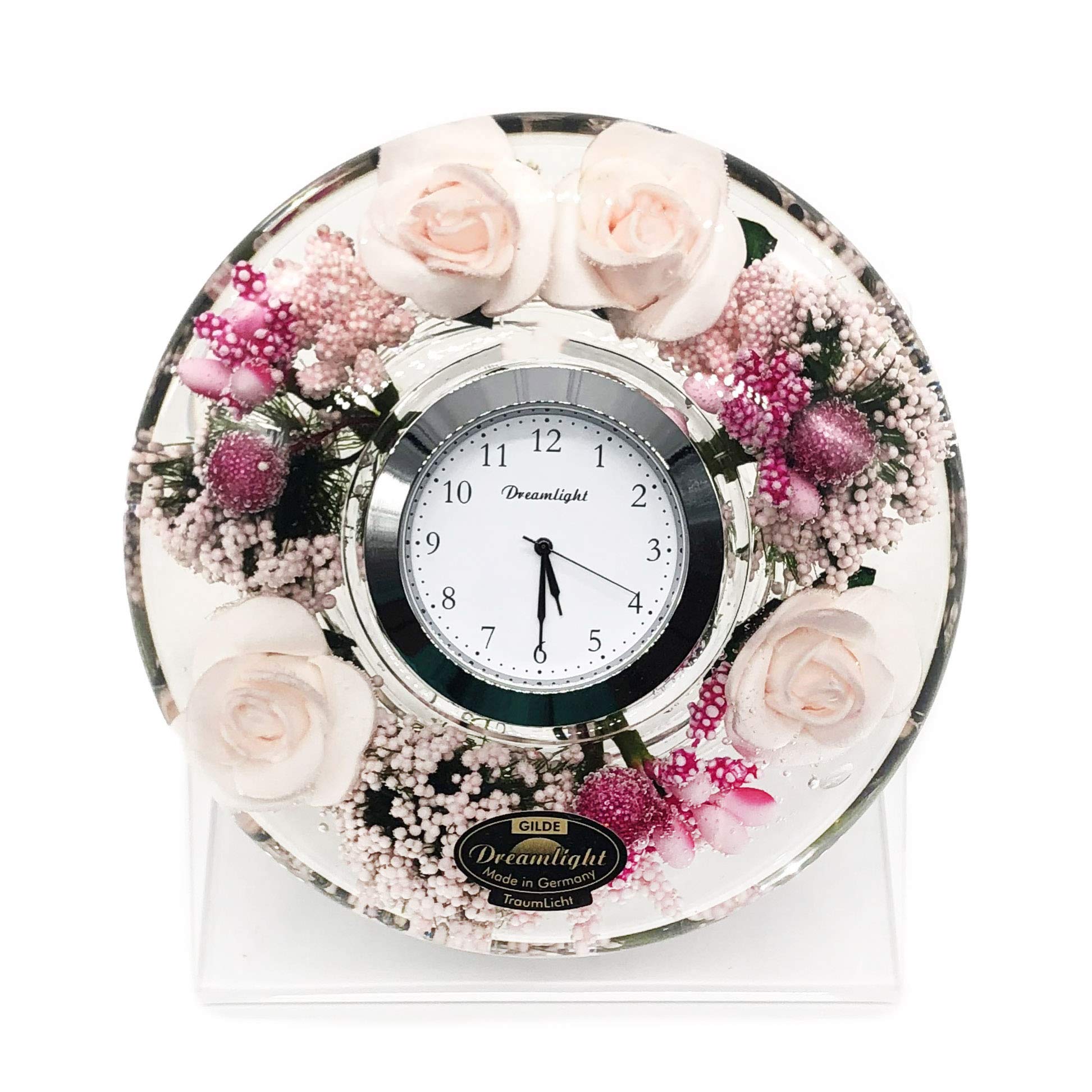 ひとつひとつをハンドメイドで仕上げたナチュラルテイストのアレンジが魅力です。 インテリアのアクセントや大切な方への贈り物としても最適な新しい感覚の花時計です。 マウスブロウで形成したガラス器に、彩り豊かな花々のモチーフやビーズをジェルで封じ込めた、みずみずしいデザインが特徴です。 【リトルローズ】 愛らしいピンクの花々を、まるで花束のようにぎゅっと詰めこみました。 明るくキュートな雰囲気で、ドリームライトの中でもベストセラーを誇ります。 ●付属品:時計保証書/説明書・スタンド・専用化粧箱 ●サイズ 本体:直径約11cm×高さ4cm スタンド:縦8.7cm×横10×高さ5cm ●素材 ガラス・ジェル・造花 ●原産国 本体:ドイツ ムーブメント:中国 スタンド:日本 ※手づくりのため、色や形が若干画像と異なる場合がございます。 ※ボタン電池入り ※時計を外してキャンドルホルダーとしても使えます。 【レリーフに関するご注意ポイント】 ・お支払方法について 《代金引き換え便》では承っておりません。≪銀行振込み≫≪クレジット決済≫≪コンビニ後払い≫≪コンビニ決済≫に限らせていただきます。 ・レリーフ作業に入った後のキャンセルはお受けできません。ご了承ください。 ・取り寄せ商品の為レリーフのご注文は発送まで約2週間ほどいただいております。ご了承下さい。 ・お入れする内容はご注文の際に「備考欄」にご記入ください。 【デザインについて】 ・事前にデザインの確認をしていただいております。 注文をいただいたあとすぐに作業に入ることはございません。必ず『確認メール』と別に『レリーフのイメージ』の画像をメール添付にてお送りしております。 イメージ画像をお送りした翌日の午前中まででしたら変更を承ることが可能です。 ・フォントサンプル 複数のフォントのイメージをお送りすることも可能です。ご注文の際、備考欄に『FE-○○のイメージも希望』とご記入ください。 【料金について】・料金には商品代金とレリーフ代金が含まれております。 ・レリーフは文字盤の外側に「お名前」「イニシャル」「日付」「メッセージ(3単語まで)」のうち2項目までとなります。 (日本語の場合は別途¥700(税別)、メッセージの単語数が増えた場合は3単語ごとに¥500(税別)が必要となります。) ※お入れする文字を読みやすくするように文字に色付けすることも可能です。 (色付けしない場合はガラスの表面を削りますので白くなります。) フォントはこちらからお選びください。 英数字用フォント 日本語用フォントご結婚のお祝いにお勧めです。
