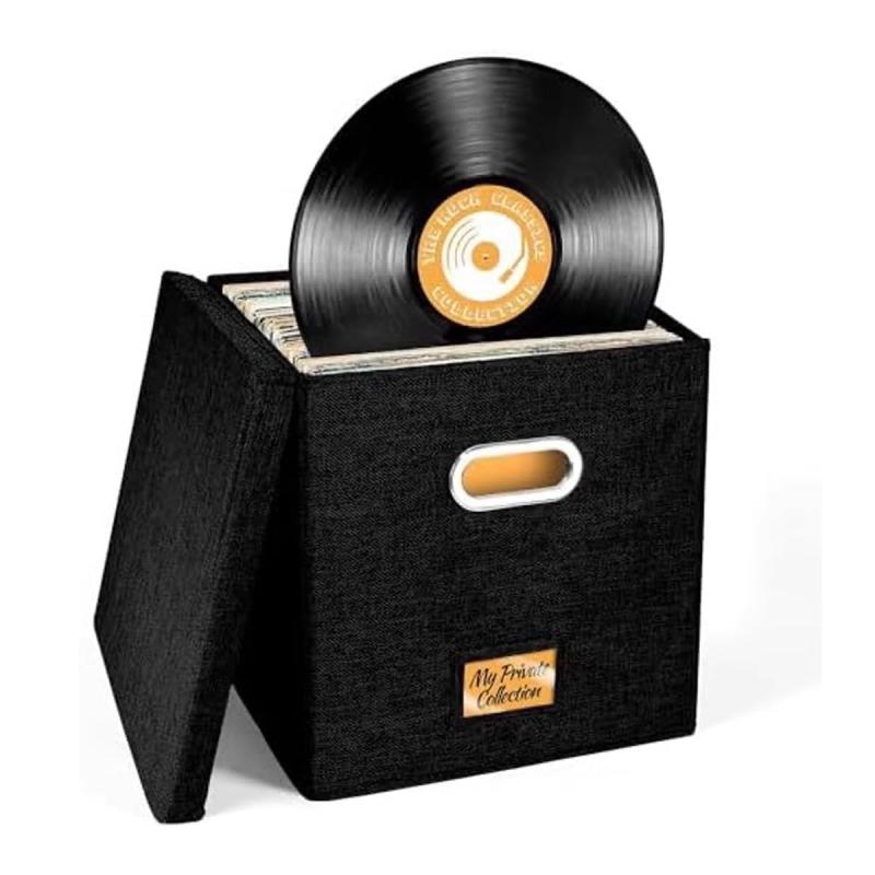 BQKOZFIN レコードケース ビニールレコード保管ボックス 長さ34.5 x 幅34 x 高い34cm 12インチ LPレコード用収納ボックス蓋付き LP盤約70枚収納可能 防塵 (ブラック)