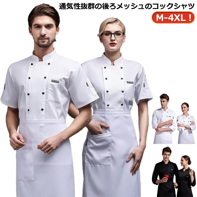 コックコート コック服 コックウェア コックシャツ トップス ユニフォーム 厨房用制服 半袖 長袖 薄手 作業服 料理長 飲食店 パン屋 ケーキ屋 コックコート 調理服 シェフ制服 後ろメッシュ 通気性 メンズ レディース 男性 女性 男女兼用 大きいサイズ M-4XL 黒 白