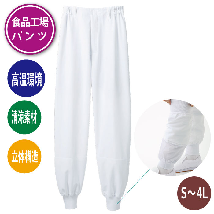 食品工場 作業着 パンツ 高温環境向け 白衣 異物混入対策 ホッピングパンツ 衛生 給食 調理 厨房 制服 食品 男女兼用 立体設計 スムースフィット 脇ゴム ネット付き 制電 イージーケア 白 住商モンブラン RL7701-2