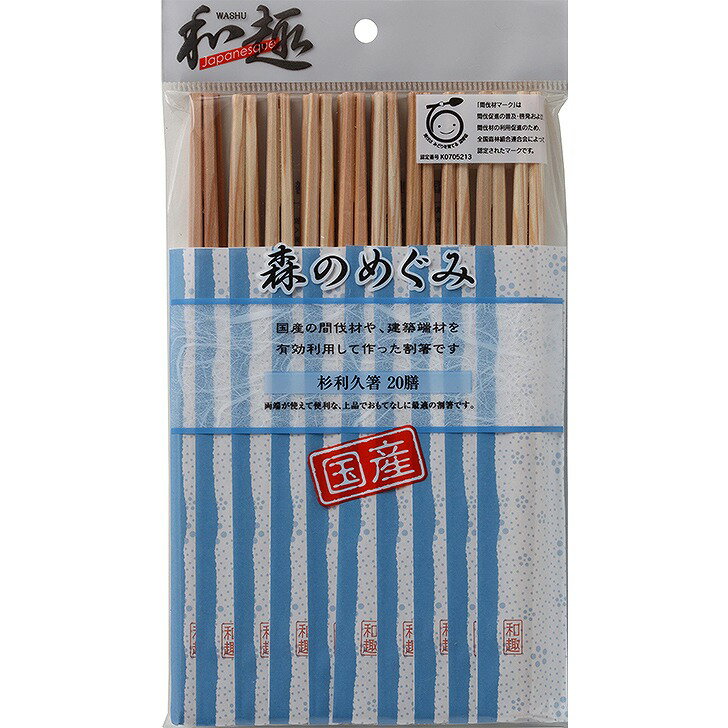 【メール便対応可】 大和物産 森のめぐみ 国産割箸杉利久箸 20膳 21093 日本製 国産 レジャー BBQ イベント お弁当 使い捨て 非常用