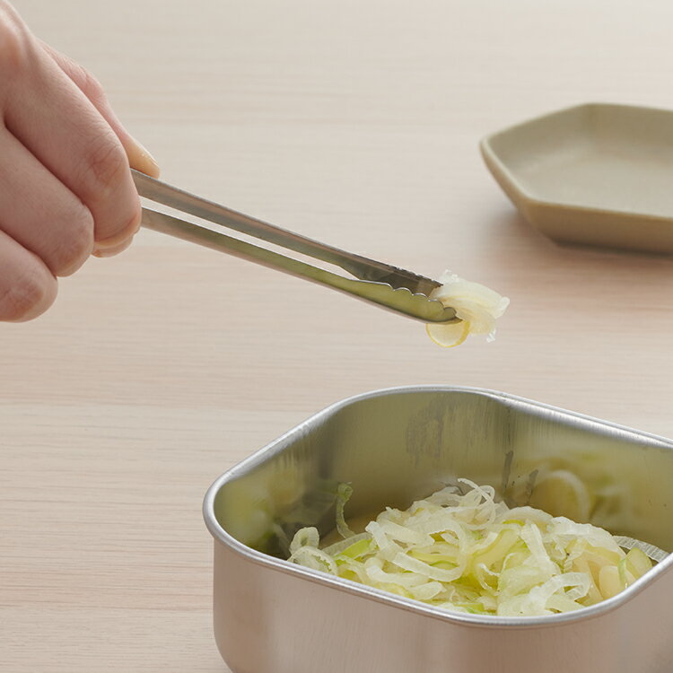 お弁当作りや薬味の取り分けに便利なミニトングです。通常強く押すと変形してしまうトングですが、薄くても強度が保てる特殊なステンレス(SUS821L1)を使用しているので、変形しにくく長くお使いいただけます。また、先端の凹凸があることで、つかみやすくなっています。食器洗い乾燥機使用可〇サイズ:W4.7×D1.2×H12.1cm/重量=約9g材質:ステンレス鋼仕上げ:マット仕上げ生産国:日本【取扱い上の注意】・用途以外の使用はさけてください。破損してケガをするおそれがあります。・衝撃的な力をかけないでください。・食器用洗剤などで洗ってからご使用ください。・白い斑点が出ることがありますが、これは水道水中に含まれるカルシウム、マグネシウムなどの成分が残り付着したものですので無害です。・使用中やお手入れの際は、製品の先端およびエッジ部分でケガをしないようご注意ください。・鉄やアルミなどの金属製品と長時間触れさせると、サビますのでさけてください。 【お手入れ】・汚れは柔らかいスポンジを使い、食器用洗剤などでよく洗い落としてください。・ベンジン、シンナー、アルコールなどの有機溶剤、酸やアルカリ性の洗剤などは使用しないでください。・たわし・みがき粉でみがくとキズがつくことがありますのでさけてください。・サビが発生した際は、クリーム状のクレンザーを柔らかいスポンジなどにつけてこすり落とし、よくすすいでください。税込\1000以下のステンレスキッチンアイテム