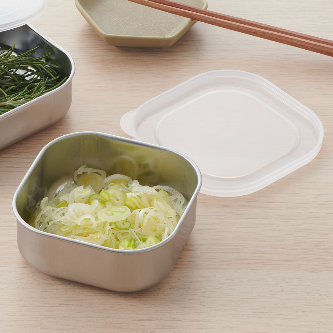 刻んだねぎや生姜など、ちょっとした薬味を入れるのにちょうどいいサイズのステンレス製の容器です。フタがついているので、余ってしまった小麦粉やパン粉、使い切らなかったスパイスなどを一時的にキープしておくのにも便利です。電子レンジ使用不可×食器洗い乾燥機使用不可×オーブン使用不可× ※密閉容器ではありません。サイズ:W10.7×D10.7×H4.2cm/容量=350ml材質:本体=ステンレス鋼、フタ=ポリエチレン(耐熱温度70℃、耐冷温度-30℃)生産国:日本【取扱い上の注意】 ・用途以外の使用はさけてください。 ・火の近くや高温になるところには置かないでください。 ・塩分、酸性の強い食材を保存すると、サビが発生するおそれがあります。 ・熱いものは中身を冷ましてからフタをしてください。 ・完全密閉ではありませんので、本体の横置きはさけてください。 ・水気や湿気のある場所での使用はサビが発生するおそれがあります。 ・異種金属と長時間触れさせると、サビますのでさけてください。 ・製氷に使用しないでください。 ・食器洗浄機、食器乾燥機、電子レンジ、直火、オーブン、グリルの使用はさけてください。 【お手入れ】 ・汚れは柔らかいスポンジを使い、食器用洗剤などでよく洗い落してください。 ・ベンジン、シンナー、アルコールなどの有機溶剤、酸やアルカリ性の洗剤は使用しないでください。 ・たわし・みがき粉でみがくとキズがつくことがありますのでさけてください。税込\1000以下のステンレスキッチンアイテム