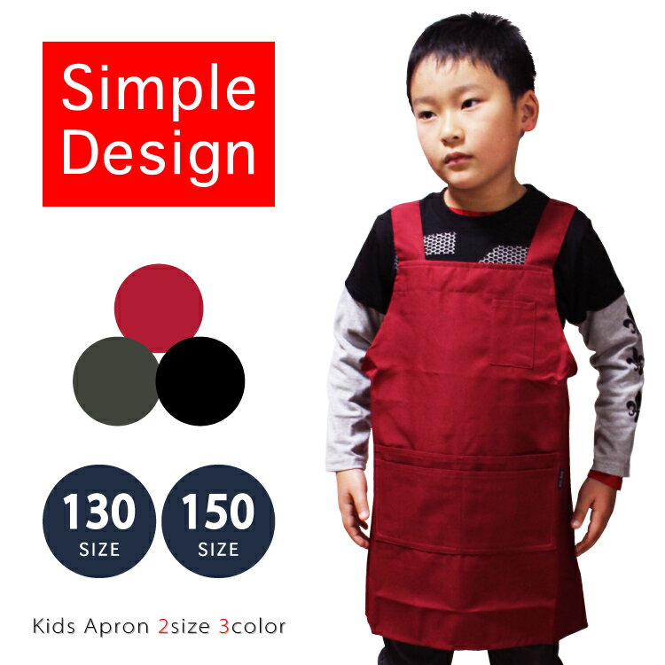 エプロン 小学生 キッズ 子供 男の子 女の子 120cm 130cm 150cm 給食エプロン 小学校 工作 調理実習 ブラック カーキ レッド 撥水 ポリエステル 無地 シンプル