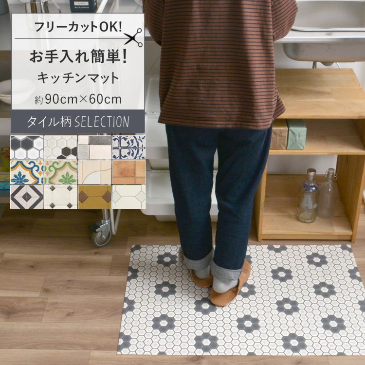 【全品対象クーポン配布中】 お手入れ簡単! 拭けるキッチンマット 固定用はがせる両面テープ付き 約 90cm × 60cm 撥水 pvcマット キッチン 台所 白 ブルー パターン ハニカム テラコッタ タイル 北欧 モノトーン 壁紙屋本舗