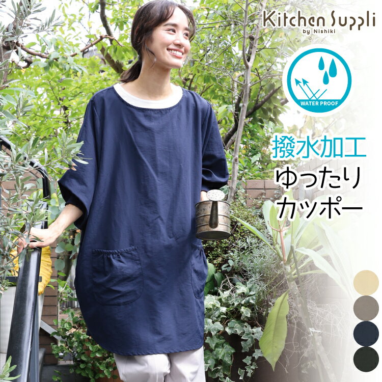 \ネコポス送料無料/ 割烹着 おしゃれ 撥水 かっぽう着 スモック タブリエ リブ袖 ワンピース 秋 春 ルームウェア 長袖 無地 レディース かわいい かぶり 軽い ナイロン100% 撥水加工 Kitchen Suppli キッチンサプリ M〜Lwht008