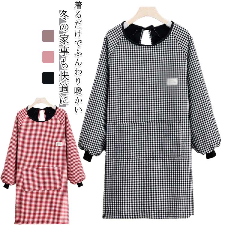 割烹着 裏起毛 あったか ロング丈 ポケット付き 防寒 暖かい ストレッチ ゆったり 割烹着おしゃれ 冬 長袖 スモック エプロン ギンガムチェック かっぽうぎ 家事 リブ袖口 秋冬 袖付き 大きいサイズ おしゃれ レディース かわいい