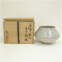 サイズ約上直径19.8×高14.8cm 約下直径14.8cm 作者岩崎新定作(陽炎園) 箱木箱 (申丸ク酒・211150) 【コンビニ受取対応商品】立礼用や長板に良く映え、他の道具と取り合わせやすい水指です。 【初代 岩崎健三】膳所の人 明治生まれ 1919年大正08年 山元春挙画伯とはかり再興 【2代 岩崎新定】初代健三の長男 1913年大正02 年生まれ 京都高等工芸学校陶磁器科卒 1987年昭和62年 膳所焼美術館を設定 1985年昭和60年 滋賀県伝統的工芸品指定 1991年平成03年 通産省より伝統産業功労者表彰 2010年平成22年 現在尼膳所焼で製陶中 現在、染付・赤絵等いろいろな物が製作される。代表作 茶入「大江山」 ----------------------------------------- 【陽炎園】 現在遠州七窯の一つに数えられる。 日本画家 山元春挙画伯が「東海道名所絵図」にも描かれた名勝「陽炎の池」が庭内にあることから命名された。 当時、小堀遠州は近江奉行であったことなどから、遠州の指導が考えられる。 遠州好みの茶入として「大江山」「白雲」が有名。 水指(水器)-釜に補給する水や茶碗・茶筌などをすすぐための水を貯えておく器物 炉・風炉の火の陽の対して水指の水を陰とします。 台子皆具の水指は本来唐物に始まり点前作法の変遷とともに皆具からはなれ銅の水指についで南蛮や国焼の備前・信楽・楽焼や京焼などの焼き物が用いられ、さらに木地釣瓶や曲などの新しい素材や形が造られた。
