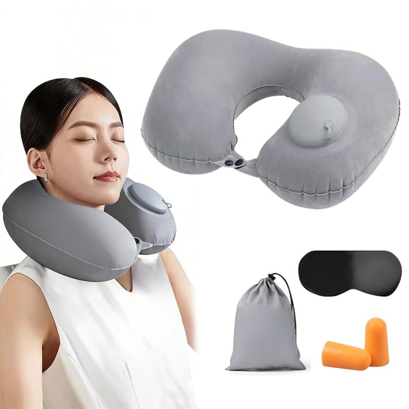ネックピロー U型 ベルベット 手動プッシュ式充気 収納袋、アイマスク、耳栓付き 5色対応 ポータブル 飛行機 バス 短時間休憩 自宅 電車 オフィス 旅行 便利グッズ