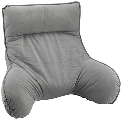 ひじ付き・グレー 肘掛・ボリュームハイバック ATBL-GY・・Color:グレー・サイズ:幅77cm×奥行60-76cm×高さ46-61cm・【ベッドの上で】そっと寄りかかれる背もたれで読書やスマホ操作が快適に・【ラグやカーペットの上で】背もたれはリクライニング7段階調節可能・【頭部の角度調節】14段階で角度を変えられるから首や肩にフィット・【ふかふか】ヘッドレストはまるで枕のようなさわり心地説明 床やベッドの上でちょっとうしろに寄りかかりたい、そんなときのふわふわ背もたれ。 座椅子のようにリクライニングできるので快適な角度でリラックス 読書やパソコン作業がさらに快適に! ローテーブルでの在宅ワークや授乳クッションとしての利用もおすすめ。