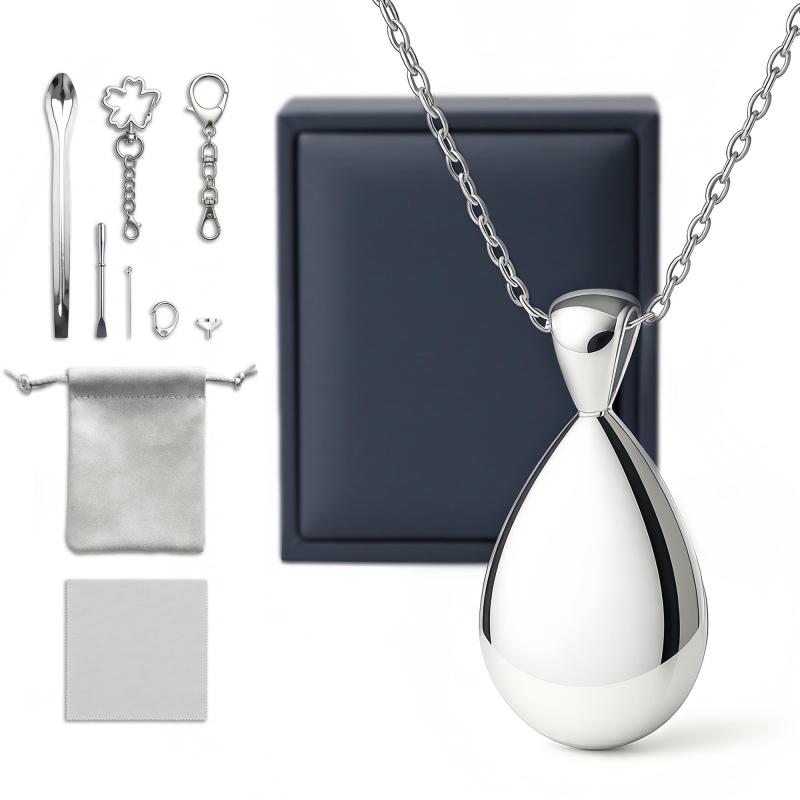 [徳芸TOKUGEI] 遺骨 ペンダント 人間 ペット メモリアル キーホルダー 雫型 手元供養 ネックレス ステンレス 低アレルギー 防水 遺灰入れ 遺骨入れ 遺髪入れ 納骨キット付き 自由組み合わせ ギ❤️【豊富な付属品で届いた瞬間から寄り添える】ミニスプーン、じょうご、交換用キーチェーンパーツ、防水ポーチ、ポリッシングクロスなど、納骨に必要なものがすべて揃った安心セット。届いたその日から落ち着いた気持ちで大切な存在を丁寧におさめ、胸元でそっと感じることができます。やわらかな雫型フォルムが心を包み込み、悲しみや想いを静かに受け止めてくれる小さな器です。❤️【自由に組み合わせて携帯】ネックレスとして胸元に、バッグチャームやキーチェーンとして外出先にも。気分やシーンに合わせて自由にスタイルを変えられます。雫のようにどんな場所にも自然になじみ、持つ人の生活に溶け込みながら、いつもそばで寄り添う存在になります。❤️【生活防水&防錆仕様】ネジ部分には防水Oリングを採用し、日常の水滴や汗から大切な中身をしっかり守ります。ステンレス素材は錆びにくく、美しい輝きを長く保ちます。ずっとそばに置いておきたい思い出を、安心して託せるペンダントです。❤️【アレルギー対策&やさしい着け心地】肌にやさしいサージカルステンレス製で、金属アレルギーが気になる方も安心。なめらかな雫型は肌に沿いやすく、軽やかな着け心地で一日中身につけても負担になりません。胸元に手を添えると、しずくが心を浄化してくれるようなやさしさを感じられます。❤️【想いを託す雫型メモリアルペンダント】遺灰・遺骨・遺髪・毛・小さなメッセージを少量そっと納めることで、離れていても胸元でぬくもりを感じることができます。雫型は涙ではなく、清らかな思いが未来へと流れていく象徴。大切な存在を胸に抱きしめ、どこにいても絆を感じながら一歩ずつ前へ進む力をくれる特別なアクセサリーです。