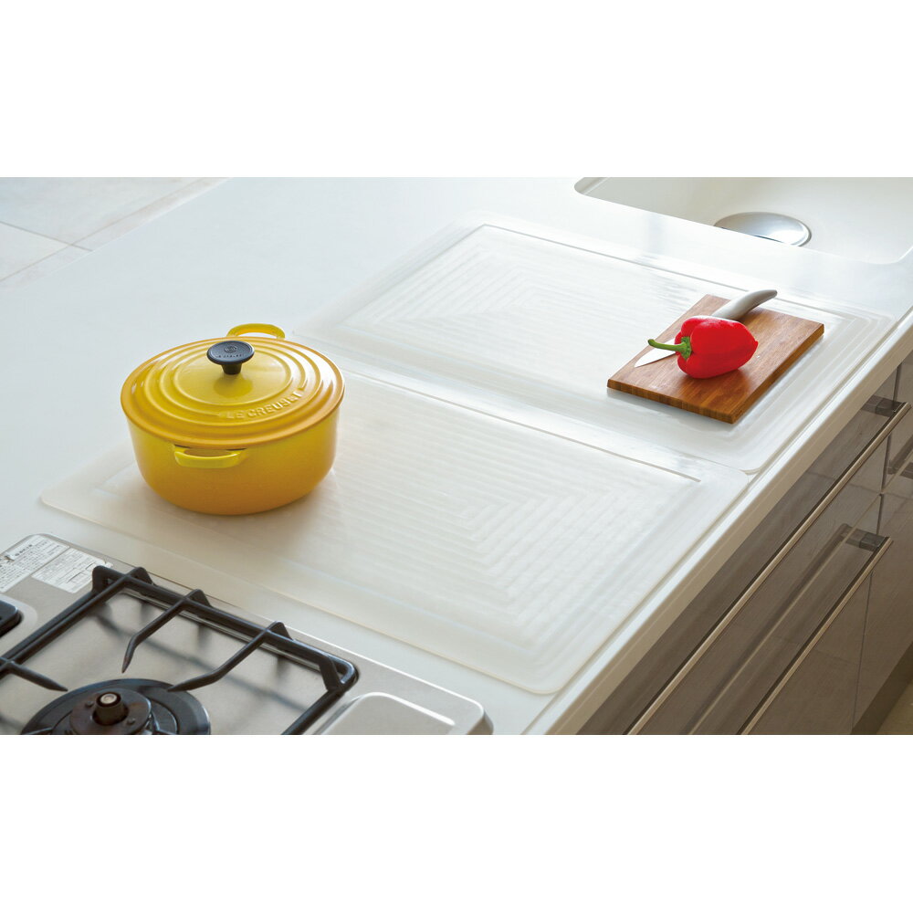 \お気に入りのキッチンカウンターを綺麗に守りませんか?/愛用者続々!「キッチン用半透明保護マット」人工大理石やステンレスなど、傷つきやすい素材のキッチンカウンターを保護する半透明マット。でも、ただのマットではないんです!普段のお料理を快適にするための工夫が色々あります♪【オススメポイント1:吸盤付きでズレにくい!】「野菜のスライスや大根おろし、力を入れないといけないけど、滑って危険!」なことってありませんか?この保護マットはシリコン製かつ、裏面に吸盤がついているので、しっかり吸着してズレにくい仕様なので、大根おろし等も安定してお使いいただけます!【オススメポイント2:カウンターが水びだしになりにくい様工夫した設計!】「トマトや、水分を多く含んだ野菜を切ると、その水分がまな板からこぼれて、カウンターがびちょびちょ…さらにその水分が床にこぼれて床もびちょびちょ…」なんて経験ありませんか?このマットは表側に3辺にわずかな立ち上がりがあるため、切った野菜の水分等が外へ流れ出すのを防いでくれます。【オススメポイント3:熱いものも直置きOK!耐熱180度】180度までの耐熱仕様なので、オーブンの天板や鍋も直接おけます!【他にも色んな使い方が…!】水切りラックの下におけば、キッチンカウンターが水滴で濡れるのを防いでくれたり、パンをこねたり、ピザを作ったり、クッキングマットとしてお使いになるのもオススメです♪ページ下部に画像の説明がございます。一部別売りの商品もございますので、説明文ご確認のうえご注文ください。>画像の説明はこちら<仕様・サイズ[サイズ]【約57.5×45cm】【約65×60cm】【約80×60cm】[すべてのサイズに共通]■厚さ:約4mm■素材:シリコン■耐熱温度:−40〜180℃■裏面は吸盤仕様■中国製(原材料・企画…日本、加工…中国)【送料マーク:A】 この商品の販売価格には配送料880円(税込)が含まれています。 画像の説明※画像は商品を2枚組み合わせた状態です(お届けするのは1枚です)裏面の吸盤によりしっかり吸着。マット上で生地をこねたり、ピザづくりも。熱いものも直置きOK 180℃までの耐熱仕様なので、オーブンの天板や鍋も直接置けます。お手入れもカンタン 水や汚れに強く、布巾でサッと拭くだけでOK!すべりにくいシリコン製だからスライサーやおろし金も安定して使える!3辺に段差があることで、外に水が漏れにくい!