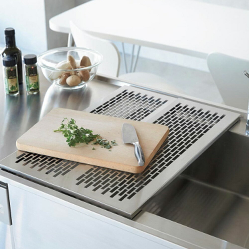 ※ご注意ステンレス部分にはキズ防止用のフィルム状保護シートが付いている場合があります。一度剥がしてしまいますと、ご返品をお受けできませんので十分ご注意ください。 調理スペースとしても水切りとしても活躍する、耐荷重15kgのタフなステンレス製サポート台です。オールステンレスだからサビにくく、見た目の美しさも◎。ステンレスのモノづくりが得意な燕三条製です。シンクの上に広がる作業スペース!調理中に「もう少し作業スペースが広かったら…」そんな思いを抱いた経験はありませんか?そんな方におすすめの耐荷重15kgのタフなステンレス製サポート台です。シンクに渡して設置することでキッチンの調理スペースを拡張できます。ちょっとまな板を置くスペースが欲しいときや、盛り付け時のお皿の置き場所になど、必要なときだけ便利にお使いいただけます。野菜や食器の水切りに便利な穴がポイント!水抜き穴が付いているので、食器を載せて水切りラックのように使用できます。さらに、茹で野菜や洗った果物などの入ったザルを上に置いたり、野菜を切る・盛る・洗うなど、様々な作業にフィットします。また、本体の厚みは1.5cmなので、家事が終わったらそのまま立てかけて収納することも可能。サポート台の裏にはすべり止めにもなり、接地面の傷つきを防ぐクッションゴム付きで、大事なキッチンを傷付けません。シンクの奥行と、広げたいスペース幅で選べる4つのサイズラインアップご自宅のシンクサイズに合わせて選べる、奥行47cmタイプと奥行58cmタイプ。さらに、広げたい作業スペースが幅20cmの通常タイプと、幅21〜38cmの伸縮タイプの計4サイズをラインアップ。下部のシリーズ商品からご確認ください。金属加工で有名な新潟県・燕三条地域のメーカーが手がけています清潔で丈夫なオールステンレス。高級感あるデザインだから見られても恥ずかしくなく、逆に見せたくなる美しさです。しっかりと安定感ある作りは、金属加工で有名な新潟県・燕三条地域のメーカーが手がけた証です。ページ下部に画像の説明がございます。一部別売りの商品もございますので、説明文ご確認のうえご注文ください。>画像の説明はこちら<仕様・サイズ[サイズ]奥行47cm…約幅20・奥行46.7・高さ1.5cm、重さ…約0.45kg奥行58cm…約幅20・奥行57.8・高さ1.5cm、重さ…約0.56kg奥行47cm伸縮タイプ…約幅21〜38・奥行47・高さ1.5cm、重さ…約0.88kg奥行58cm伸縮タイプ…約幅21〜38・奥行58・高さ1.5cm、重さ…約1.07kg[すべてのサイズに共通]■素材:本体…18ー0ステンレス、クッションゴム(奥行47・奥行58…4、奥行47伸縮タイプ・奥行58伸縮タイプ…6個付き)…ポリウレタン■耐荷重:15kg■日本製【送料マーク:A】 この商品の販売価格には配送料880円(税込)が含まれています。 画像の説明シンクに渡すだけで、調理スペースとしても水切りとしても活躍するサポート台。耐荷重15kgのタフなステンレス製。シンクの奥行に合わせて47cm、58cmの2サイズがあります。幅は20cmまたは21〜38cmの伸縮タイプから選べます。水抜き穴付きで食器の水切りも。野菜の水切り中のザルを置いても水浸しにならず便利です。本体の厚みは1.5cm。しっかり頑丈で、まな板や重い鍋を置いても安定感があります。裏面には接地面の傷を防ぐクッションゴムが付いており、滑り止めの役割も果たします。伸縮タイプは21〜38cmの幅で必要に応じて広げられます。全部で4タイプから選べます。(1)奥行47cm×幅20cm、(2)奥行47cm×幅21〜38cm、(3)奥行58cm×幅20cm、(4)奥行58cm×幅21〜38cmお届け時の状態。白い保護フィルムが付いていますので、ご使用前に角からはがしてください。