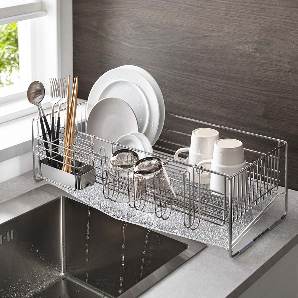 ワイヤーの太さや本数など細部までこだわってつくられているので、小皿はもちろん大皿や重い鍋も安定して置けます。高級感のあるアクリルトレーはキッチンを明るい雰囲気に。ステンレスのモノづくりが得意な燕三条製です。奥行54cmでシンク横にぴったり置けるアクリルトレーの水切りスペースをフル活用できると評判のロングセラー。高級感のあるすりガラス風のアクリルトレーが空間を明るく見せてくれます。水垢汚れも付きにくく、お手入れしやすいのも魅力。設置幅19cmのスリム、24cmのレギュラー、33cmのワイドの3サイズから選べます。水が流れやすいアクリルトレートレー中央に凹みをつけて水の流れをよくしているので、水捨ての手間がかからず毎日清潔に使えます。水が流れやすいアクリルトレーは汚れもサッと落ちるアクリルトレーの表面は水が流れやすいツルツルとした質感で、裏面は凹凸のあるすりガラス風の高級感あるデザイン。まるで本物のガラスのようにキラキラ輝いて気分が上がり、洗い物がはかどります。その差は歴然!シンク周りがぐんと明るくなる!アクリルトレーは光を通すので、一般的なステンレストレーなどと比べて圧迫感が少なく、シンク内が明るくなります。手狭なキッチンにぴったりのスリムサイズ設置幅19cmのスリムサイズなら、狭いキッチンにも設置可能。大皿も安定して立てられます。一番人気のレギュラーサイズ設置幅24cmのレギュラーサイズは、食器はもちろん重たい鍋も余裕で入ります。キッチンスペースに余裕があるなら迷わずワイドサイズ設置幅33センチのワイドサイズは、大きいフライパンなどの調理器具もラクラク収納。「箸立て」と「グラス&まな板スタンド」付き取り出すのが面倒なグラス類を外側のホルダーに置けて便利。また、2.5cmの厚み以下のまな板を安定して置くことができます。便利な「箸立て」付き「箸立て」は内部が3つに分かれているので、お箸やスプーン、フォークなどを分類して収納することが可能。底は取り外して洗えるので常に清潔を保てます。金属加工の町・新潟県燕三条地域で製造頑丈なステンレス製ワイヤーを曲げる、溶接する、組み立てる。金属の性質を熟知した職人が5人で手分けしても、製造数は1日100個程度だとか。丁寧な作業から信頼と安心の製品が作られています。ページ下部に画像の説明がございます。一部別売りの商品もございますので、説明文ご確認のうえご注文ください。>画像の説明はこちら<仕様・サイズ■サイズ:【全サイズ共通】奥行54cm高さ16.7cmスリムサイズ…約幅19cm(トレー含む)、水切りカゴ内寸…幅17cm奥行52cm高さ10cm、重量:1.7kgレギュラーサイズ…幅24cm(トレー含む)、水切りカゴ内寸…幅22cm奥行52cm高さ10cm、重量:1.9kgワイドサイズ…約幅33cm(トレー含む)、水切りカゴ内寸…幅31cm奥行52cm高さ10cm、重量:1.7kg■素材:本体・付属品…18-8ステンレス、トレー…アクリル樹脂■箸立て、グラス&まな板スタンド(厚さ2.5cmまでのまな板に対応)付き■日本製【送料マーク:A】 この商品の販売価格には配送料880円(税込)が含まれています。 画像の説明奥行54cmでシンク横にぴったり置けるアクリルトレーの水切り水が流れやすいアクリルトレー水が流れやすいアクリルトレーは汚れもサッと落ちるその差は歴然!シンク周りがぐんと明るくなる!幅19cmのスリムサイズ幅24cmのレギュラーサイズ幅33cmのワイドサイズ手狭なキッチンにぴったりのスリムサイズ一番人気のレギュラーサイズキッチンスペースに余裕があるなら迷わずワイドサイズ「箸立て」と「グラス&まな板スタンド」付き便利な「箸立て」付き金属加工の町・新潟県燕三条地域で製造