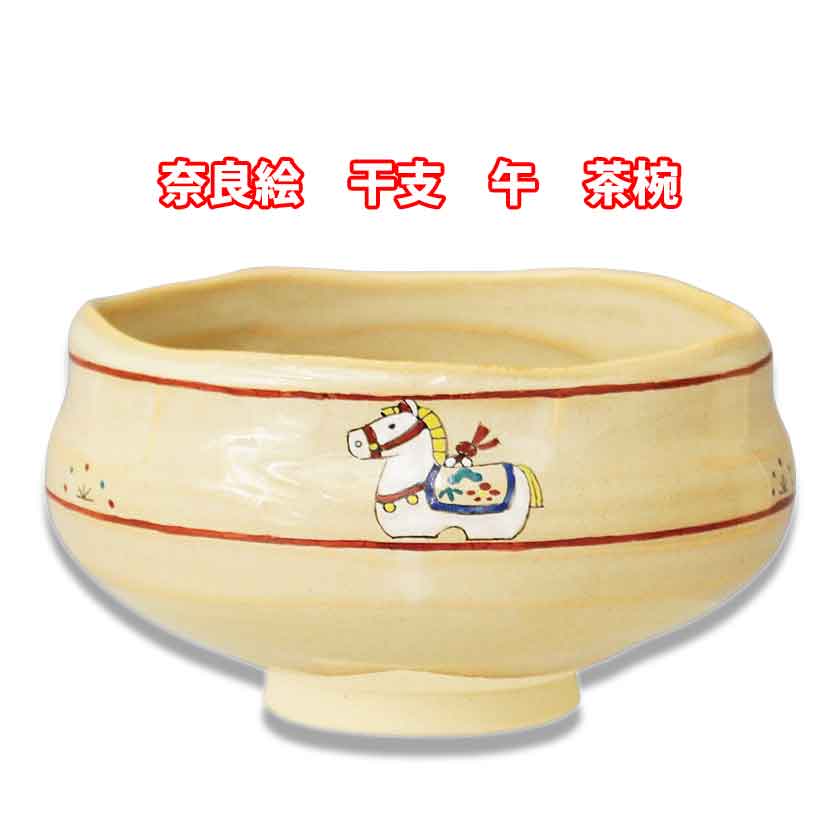 【お取り寄せ商品】茶道具 赤膚焼 奈良絵 干支(午) 抹茶茶碗 昭山窯作 化粧箱入り