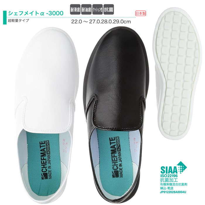 日本製で安心! 安全! 抗菌、防滑タイプの食品・厨房用スニーカー。 レストランや厨房、食堂、食品関係で働く方に適した、「シェフメイト」のスリッポンシューズ。 余計なものを省いたスタンダードなデザインで、幅広い職場や用途に対応できるのが魅力。 アッパーに光沢のある日本製クラリーノ(人工皮革)を使用しているので、お手入れが簡単です。 ゆったりとした3E設計なので、長時間の着用でも快適。 ソールはキュービックソール(EVA底)で軽い! ■カラー[白][黒] ■サイズ[22.0cm-29.0cm] ■ワイズ[3E] [シェフメイト α-3000]