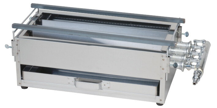 *この機種は、LPガス(プロパン)仕様です。焼鳥屋さんご愛用のガス式焼鳥器です。イベント、学園祭でも大活躍!焼き鳥を焼く音と、芳ばしい香に誘われて、ふらっと入りたくなっちゃいます!*ガスバーナーの上に「山型」と呼ばれるステンレス製の板を乗せ、加熱されたステンレス板の放射熱を利用することで、炭火に近い効果を得ています。*火の管理がめんどうな炭用コンロに較べ、イベント、学園祭でもお気軽に利用できます。サイズ:600×225×H175mmガス接続口:LPガス/9.5 都市ガス/13 重量:9.0kg*写真は、全て3本バーナー仕様です。*焼き網、ガスホース、ガスバンドは付属されません。★「送料無料(北海道、沖縄県、離島、一部地域は除く)」ですが、玄関渡しとなります。(北海道、沖縄県、離島の場合は、別途送料が発生致します。予め、ご了承下さい。) *この機種は、LPガス(プロパン)仕様です。 写真は、全て3本バーナー仕様です。 *焼き網、ガスホース、ガスバンドは付属されません。