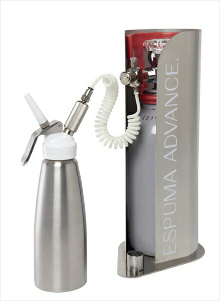 【商品説明】 ・エスプーマアドバンスのサイズ;175mm×255mm×高さ450mm ・Lサイズ約200回充填くらい ・セット内容;ガスタンク用スタンド、圧力調整部品、ホースジョイント付き、ディスペンサーL(シルバー) ・材質;ステンレス ・ディスペンサーLサイズ;直径;95mm×高さ330mm ・容量;最大使用約800cc(約40ショット) ・材質;ステンレス 【返品と交換について】 当店のすべての商品は発送後の返品と交換はお受けいたしておりません。また商品や数量によっては注文確定後のキャンセルもお受けできない場合があります。自由が丘グランシェフは日本で最初にエスプーマを販売した店として、今、自信をもってお勧めいたします。 商品は自由が丘グランシェフで手に取ってご覧いただけます。 【エスプーマ購入と使用の流れ】 ・エスプーマアドバンスの購入(定価¥84.260)ガスタンク用固定スタンドとディスペンサー充填金具接続ホース付き ガス会社への登録用紙在中 ・エスプーマ ディスペンサー(口金付きハンディボトル)の購入(Lサイズ定価26.950円、Mサイズ¥25.300円、Sサイズ¥17.490円)扱いやすいのはLサイズ(本場ヨーロッパではLサイズだけを販売) ・エスプーマアドバンスに付属するガス会社登録用紙に記入郵送、亜酸化窒素入りガスタンクをガス会社より届けてもらう(¥20000円前後地域のガス会社によって多少値段に誤差有) 以上がエスプーマ購入から使用できるまでの流れです。 *こちらの商品はディスペンサーLサイズがセットになっているので、別に購入の必要はありません。 ■亜酸化窒素(無味・無臭)は炭酸エスプーマCO2と違い材料の味が変化せず、ご希望の味のまま泡にすることができます。販売店に騙されてCO2エスプーマを購入された場合、泡は酸っぱくちくちく痛い感じで、とうていまずい味になります。 ■食材によって泡になりにくいものは(水、ポンズ、醤油など)日本製の増粘剤シェフズミラクルやSOSAのエスプーマコールドなどを材料の3〜5%混ぜることによって、しっかりした泡メレンゲをつくることができます。 ■ディスペンサーのボトルに入れのは液体だけです、微細な固形でも混ざっていると口金部分がつまってしまいます。 ■ボトルの中のとろみ材としてゼラチン系のものを使った場合は冷蔵庫で保管すると、ボトルのなかがゼリーになって固まってしまうので、ゼラチン系は混ぜた場合は冷蔵庫で保管しないでください。 ■ガスタンクは火気厳禁です、自家用車での移動は禁止です。ガス取り扱いにご注意ください。 ■ディスペンサーの洗浄は完全に中の材料とガスを使い切ってから蓋をあけて洗浄したりしてください。ガスと材料が中に残った状態で蓋を開けようとすると圧力でふっ飛ぶので危険です。
