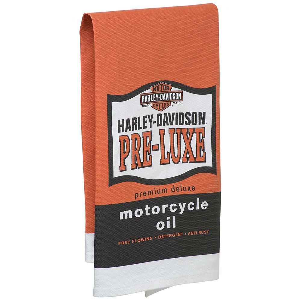 ハーレーダビッドソンの純正オイル「Pre-LuxePremiumMotorcycleOil」のボトルデザインが施されたタオル。コットン100%素材で、有機顔料を使った美しいシルクスクリーン印刷。便利な吊り下げ用のコーナーループ付き。