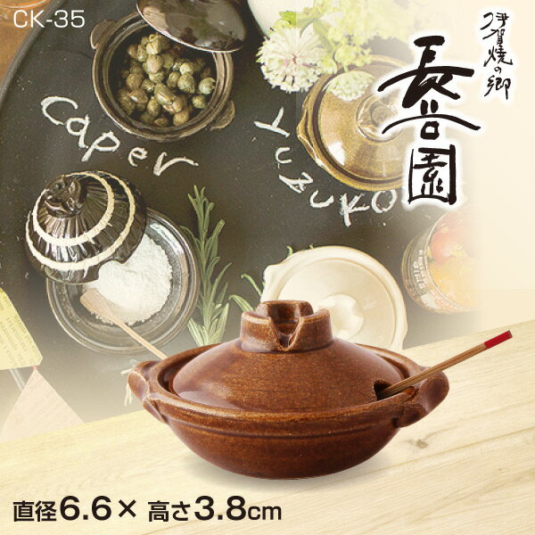 ちびかまど ちびタジン ちびどなべアメ ちびどなべシロ サイズ : 直径6.6×高さ3.8cm 付属品 : さじ付 長谷園の薬味入れ ちびどなべ アメです。 伊賀焼の郷『長谷園』(長谷製陶株式会社)は、1832年(天保3年)の創業。「日常の器だからこそ こだわりたい。作り手は真の使い手であれ。」をモットーに、楽しさ、おいしさに出あえるさまざまな卓上調理器を作り出している会社です。 長谷園はおいしさ・使いやすさ・雰囲気を追求したモノづくりをしています。 食卓で楽しく使える、ちびサイズの薬味入れです。こちらは長谷園の定番商品の土鍋を手のひらサイズに小さくした薬味入れになります。さじ付です。 サイズ:直径6.6×高さ3.8cm 付属品:さじ付 関連ワード:薬味入れ ちびどなべ アメ/CK-35/ACK-35/長谷園/土鍋/薬味入れ