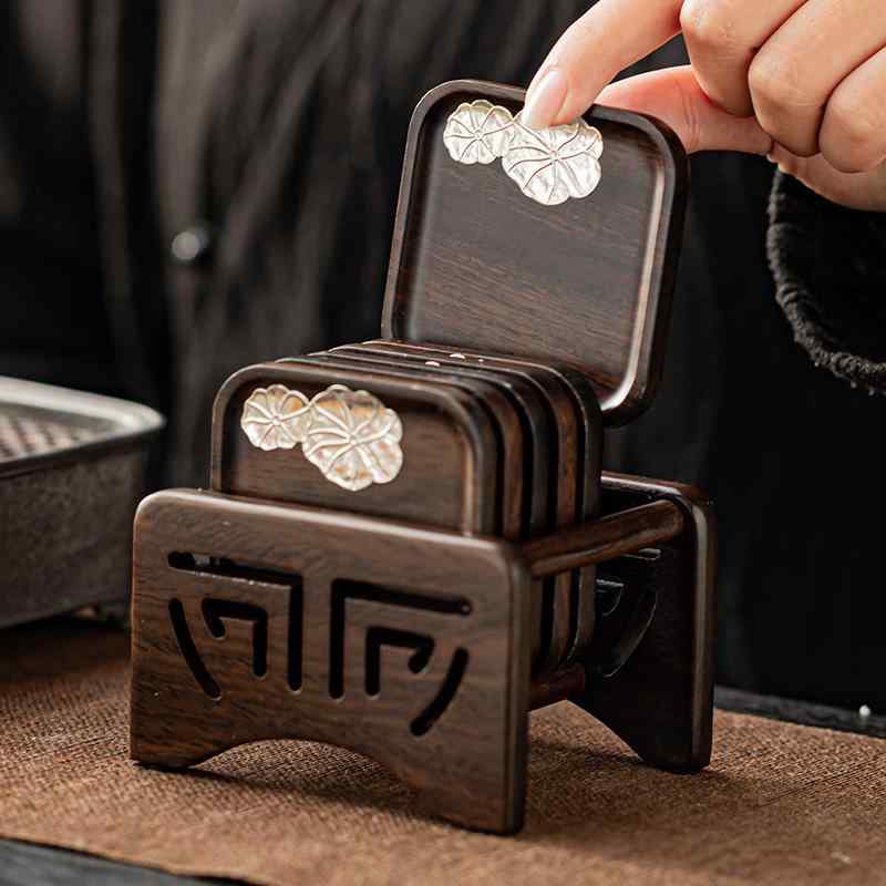 2個セット・カテゴリ: 茶道アクセサリー・スタイル: 中式・主な素材: 黒檀木、花梨木、電木・デザイン: 四角、丸型、双葉、楓葉、景物、銀杏、銅縁・セット内容: コースター6枚組、コースター6枚組・茶巾・筆