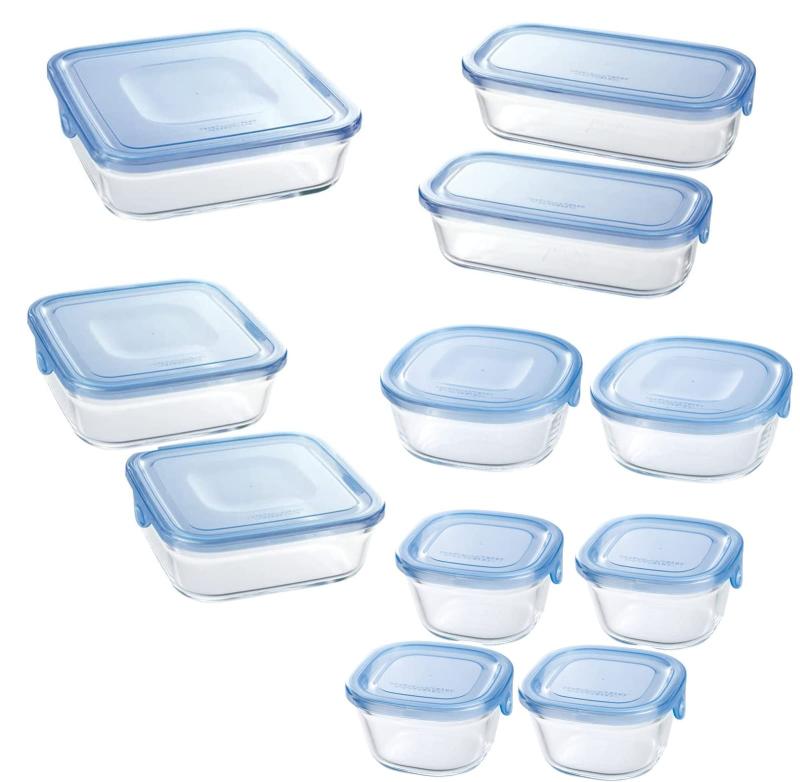 iwaki(イワキ) 耐熱ガラス 保存容器 ブルー 11個セット パック&レンジ PS-NPR-11Bサイズ:200ml/幅9.3×奥行9.2×高さ5.4cm×4個、450ml/幅13×奥行12.8×高さ5.5cm×2個、500ml/幅18.6×奥行9.3×高さ5.5cm×2個、800ml/幅15.6×奥行15.6×高さ5.5cm、1.2L/幅18.5×奥行18.5×高さ5.5cm重量:200ml/160g×4個、450ml/280g×2個、500ml/330g×2個、800ml/450g×2個、1.2L/650g容量:200ml×4個、450ml×2個、500ml×2個、800ml×2個、1.2L×1個素材・材質:本体/耐熱ガラス、フタ/ポリプロピレン(耐熱温度140度)生産国:中国機能:電子レンジ・オーブン対応可注意:オーブン使用時はフタを外してください。直火不可食洗機:ガラス本体/可、フタ/可