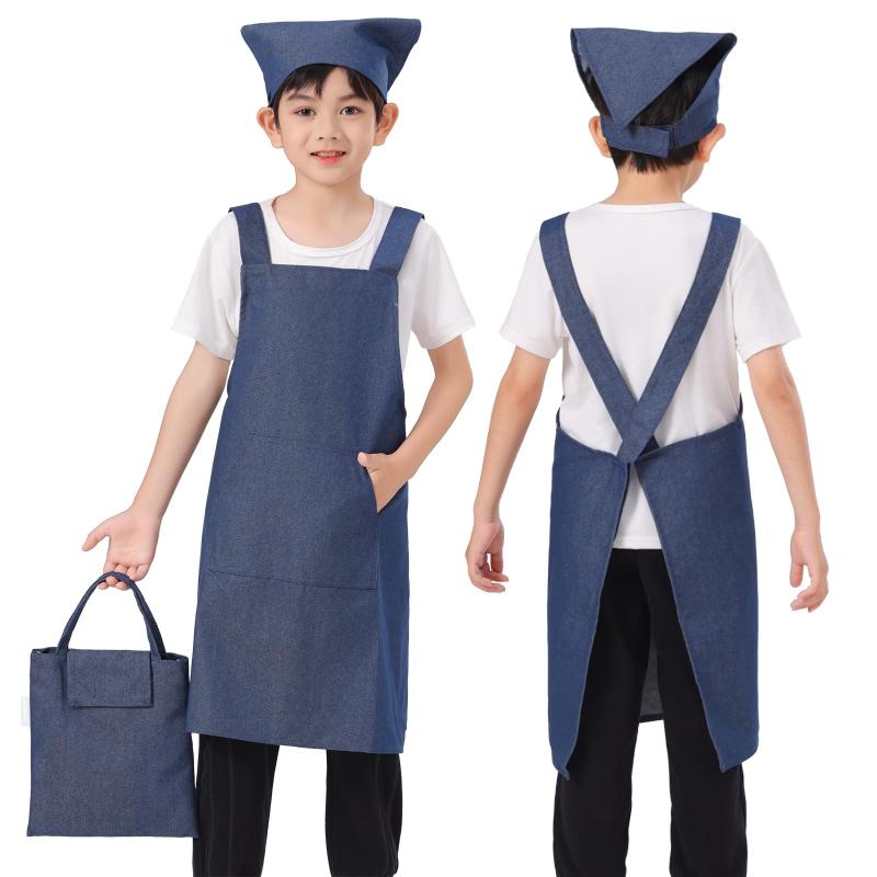 [BIGHAS] キッズ エプロン 3点セット 子供 三角巾 巾着バッグ 無地 男の子 女の子 色落ちしない ホコリが付きにくい (高学年用(140~160cm) L, デニム)
