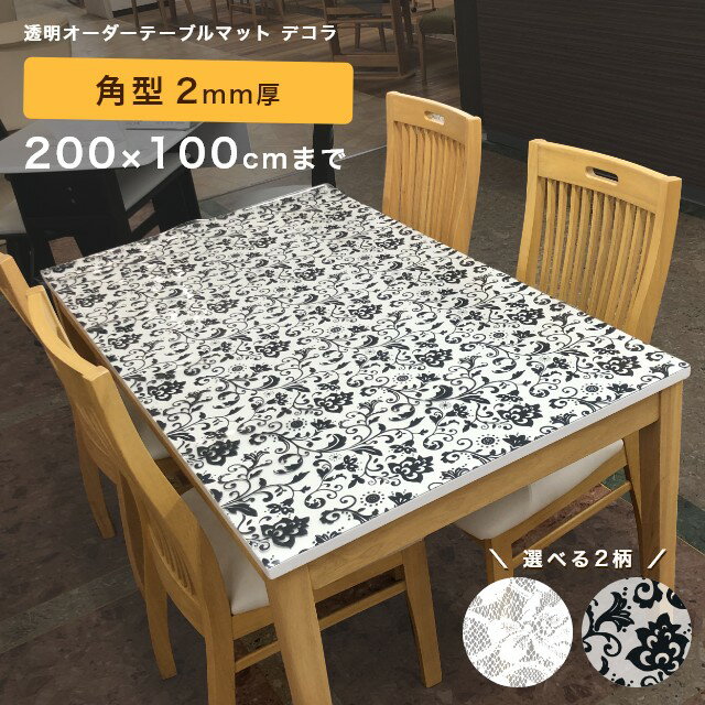 テーブルマット 透明 柄付き オーダー 両面非転写 傷隠し デコラ 角型 2mm厚 200×100cmまで 応接 事務 テレビ台 チェスト 滑りにくい 滑らない ズレない アラベスク リバーレース ダイニング 傷防止