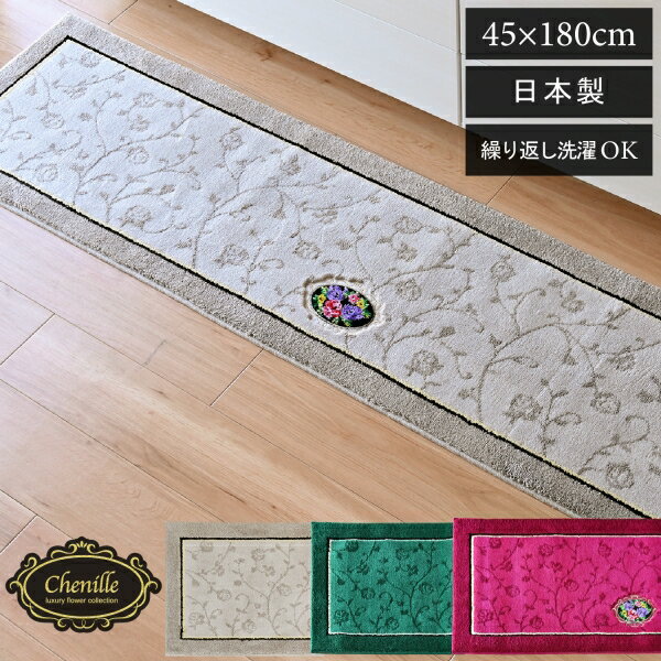 【ブラックフライデー960円クーポン配布中★】【日本製】シェニールロゼ キッチンマット 約45cm×180cm (キッチンマット 180 ロング 洗える 日本製 すべり止め キッチン 台所 お花 ゴージャス 高級 豪華 エレガント シェニール ブランド 送料無料 オカ おしゃれ )