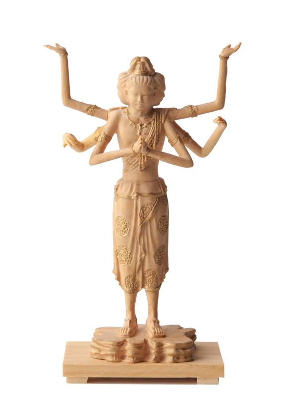 極小仏 阿修羅 (木製:ツゲ)_木彫り 仏像 仏像ワールド(GSBあしゅら極小仏シリーズ: 実物のイメージそのままの造形バランス 用途や場所を選ばずお楽しみいただける極小サイズの木彫り仏像本体サイズ:高さ95×幅56×奥行33mm 重量:約17g素 材:天然木(ツゲ)製品内容:本体・台座 桐箱入生産国:中国備考:商品は一体一体手作業で仕上げを行っており、高レベルな均一化を図っておりますが、まったく同一の商品はございません。また、木目や彩色などが一体一体微妙に異なりますので予めご容赦ください。国宝「阿修羅像」がモデル。釈迦如来を守護する「八部衆」の内の一尊。 守護神でありながら憤怒の表情を示さず憂いの表情で人々を魅了する天平時代の傑作。内に秘めた繊細な心理を三面六臂で表現した躯体は見るものによってその表情を変える。