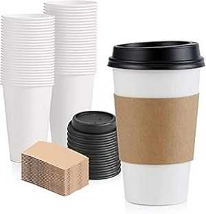 [50個パック] 16オンス ホット飲料 使い捨て ホワイトペーパー コーヒーカップ ブラックドーム蓋とクラフトスリーブコンボ付き、ミディアムグランデ Fit Meal Prep [50 Pack] 16 oz Hot Beverage Disposable White Paper Coffee Cup with Black D