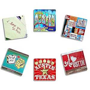 EXIT82ART - ラバードリンクコースター (6 個セット)。テキサス州オースティンのストリートの壁画。吸収性。食器洗い機対応。 EXIT82ART Life in Pictures. EXIT82ART - Rubber Drink Coasters (Set of 6). Austin, Texas Street Murals. Absorben