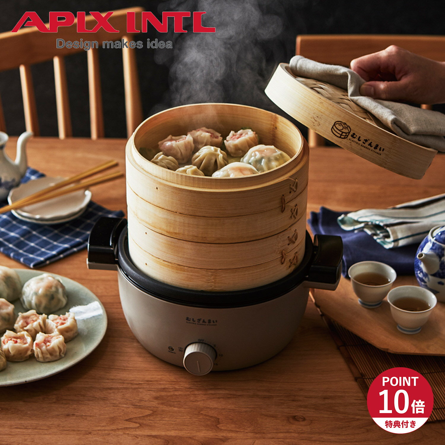 【特典付き】 APIX INTL アピックスインターナショナル 電気せいろ蒸し器 電気スチームクッカー 蒸し調理器 むしざんまい タイマー付き 2段 レシピブック グレー AMZ-450