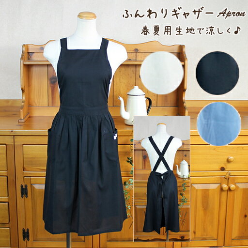 【送料無料メール便】レーヨンフレックス ギャザーエプロン<アイボリー・ブラック・ブルー>【レーヨン綿混紡/バッククロス/無地/左右ポケット/レーヨン=絹に似た素材/かわいい/おしゃれ/シンプル/】