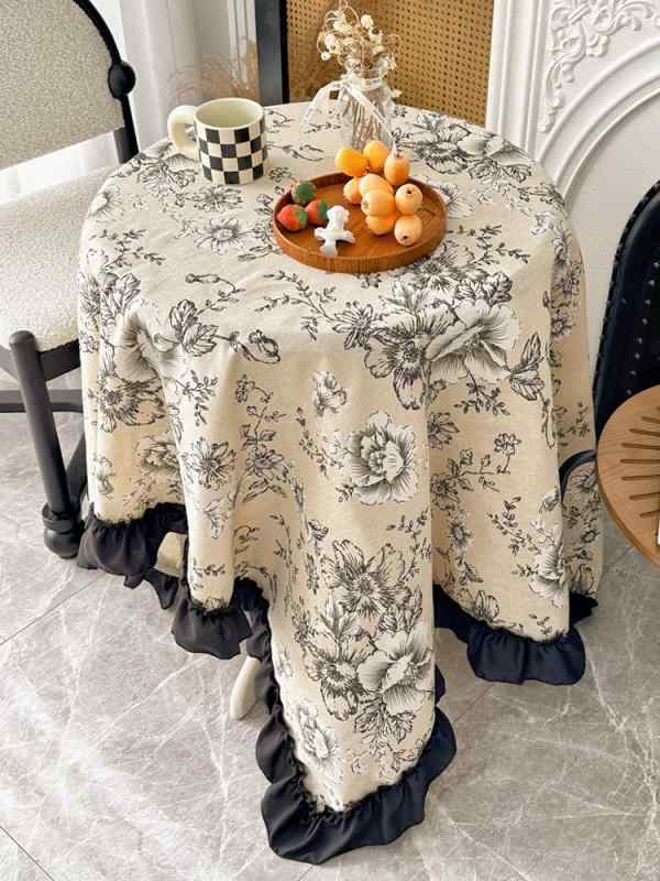 テーブルクロス フレンチスタイル レトロ ヴィンテージ風 宮廷風 北欧風 綿麻 ブラック花柄プリント フリル 耐熱 ティーテーブル リビング ダイニング サイド ナイトテーブル用 おしゃれ