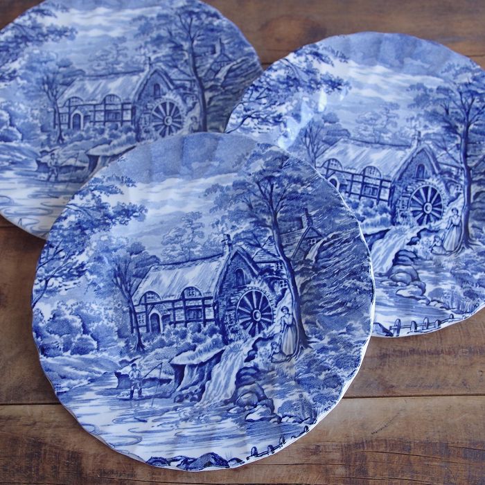 3枚セット アルフレッド・ミーキン ザ ミル ブルー デザートプレート ケーキ皿 17cm Alfred Meakin The Mill #250906 【海外直輸入中古品】